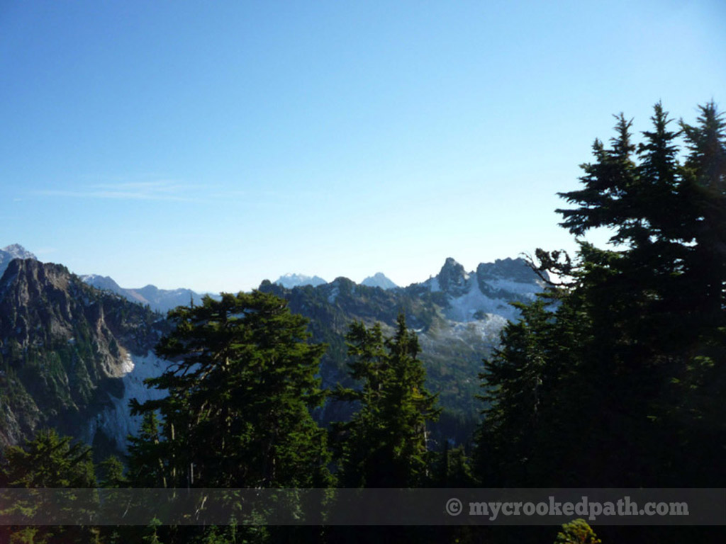 The trail climbs 2000 feet in the next 2 miles. Our group gained the ridgeline and found a nice little lunchspot that was decidedly NOT meadowlike. The views were good and a nice little break was taken. We then continued along the ridge and discovered a beautiful alpine meadow, dusted with a recent light snowfall, and amazing views. Mt. Forgotten stood smiling down on us while Glacier Peak loomed in the distance. We spent quite a while just enjoying the views and good company until the drooping sun made us reluctantly head back to the cars. Total trip was about 11 miles round trip and ~3200 feet elevation.