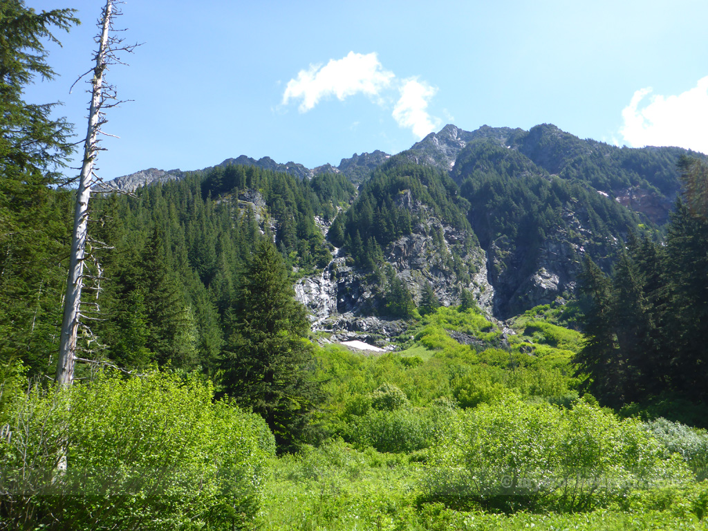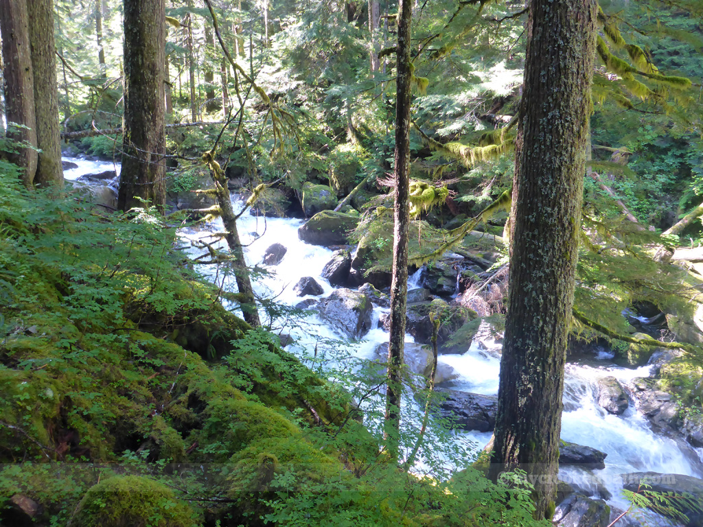 We continued along, passing more and more hikers as we made our way to our destination. The trail stays wide and flat until the last climb before the lake where it gives you a few switchbacks to the outlet. As we made our way up the last push, a loud roar echoed through the trees; Elliot Creek pours out of Goat Lake in a thunderous cascade.
