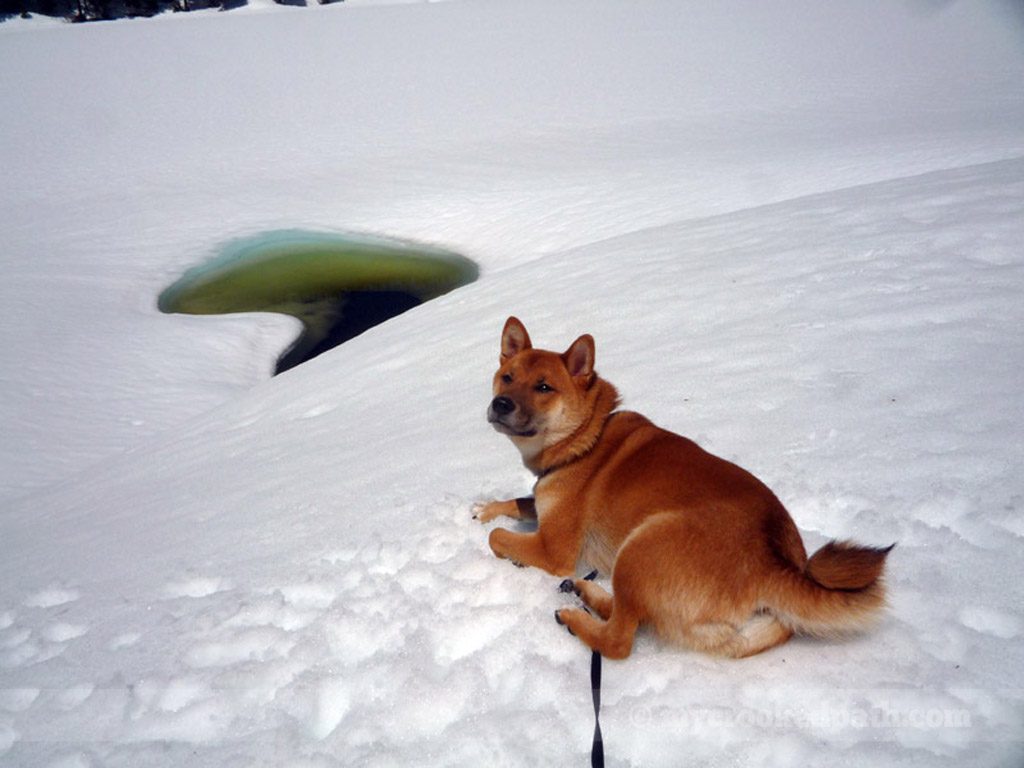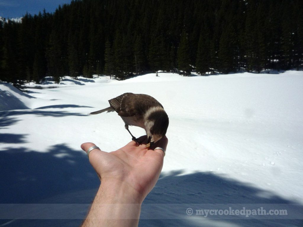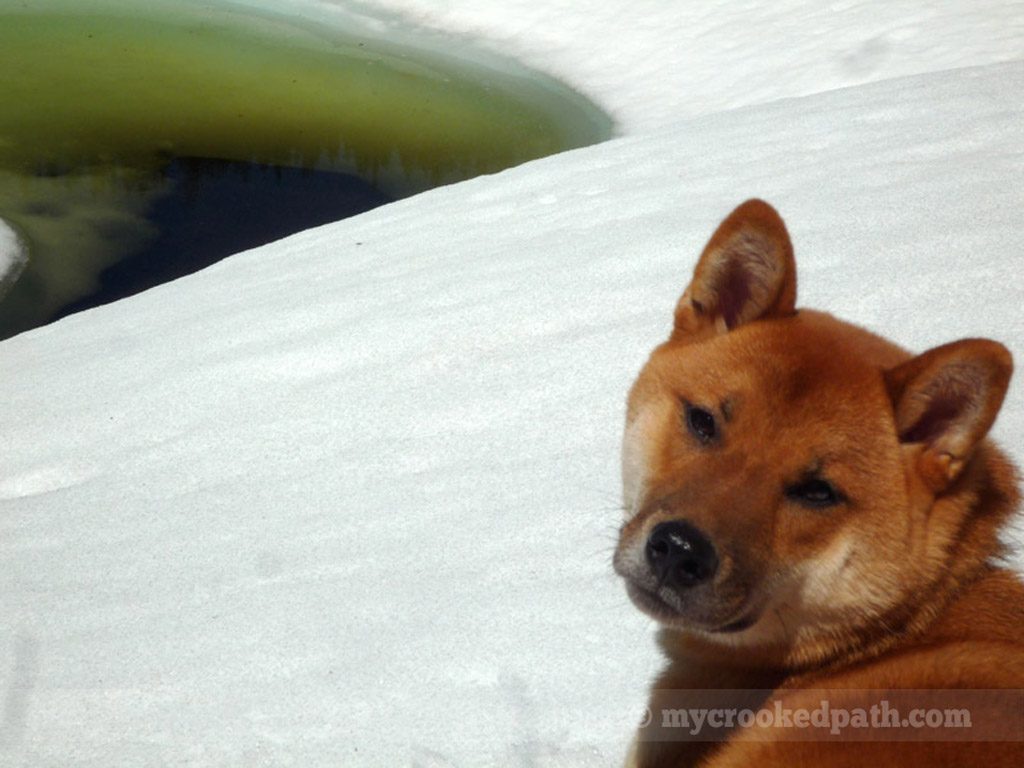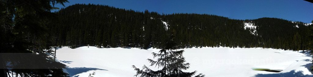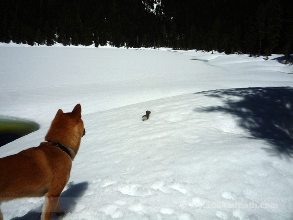 [dropcap]T[/dropcap]he first nice day of the year, I played hooky and went to check out Pratt Lake. Unfortunately, my plans changed when I hit deep snow about a mile and a half up the trail. After post-holing up to my knees, I decided to forgo Pratt and cut over to Olallie Lake instead. Well, Olallie was still snowbound as well. Had some lunch on a mound of snow and let Kirin play with the nearby Camp Robbers. Got a tan.